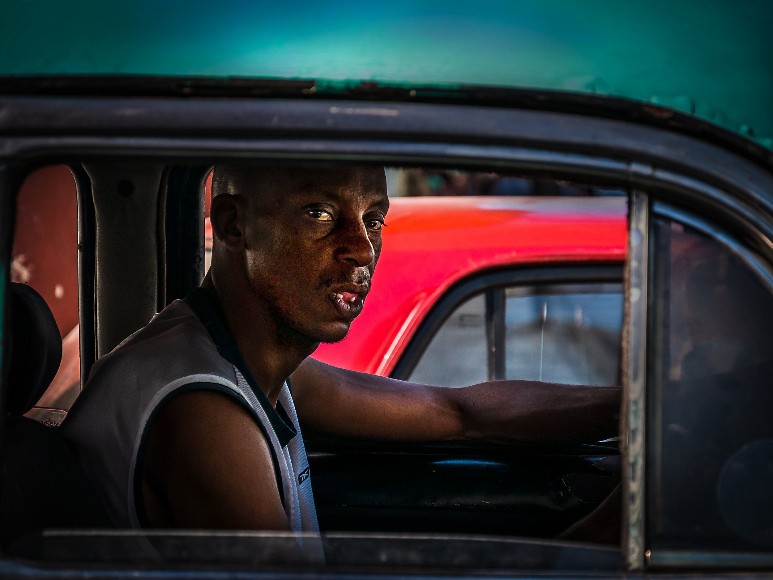One of my favorite photographs is of a taxi driver in Havana, as it captures a truly fleeting moment. I was walking through the narrow streets of Old Havana, searching for interesting subjects, when I noticed a red vintage car parked along the road. Suddenly, a taxi screeched to a stop beside me. The driver turned his head at the exact instant I faced toward him. I found his expression immediately compelling, and before he could even ask whether I needed a ride, I instinctively pressed the shutter. That brief, unplanned exchange is what makes the image special to me, it reflects the spontaneity and human connection I value in street photography.